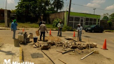 Obras Públicas repara socavón en la calle Sánchez Magallanes en Minatitlán.