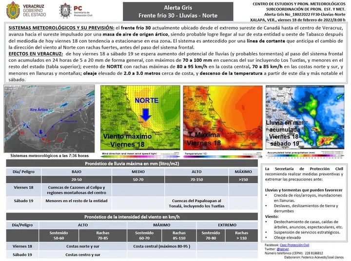 Durante hoy viernes 18 a sábado 19 se espera aumento del potencial de lluvias (y probables tormentas) al paso del sistema frontal con acumulados en 24 horas de 5 a 20 mm de forma general, con máximos de 70 a 100 mm en cuencas del sur incluyendo Los Tuxtlas, y menores en el resto del estado (tabla superior).
