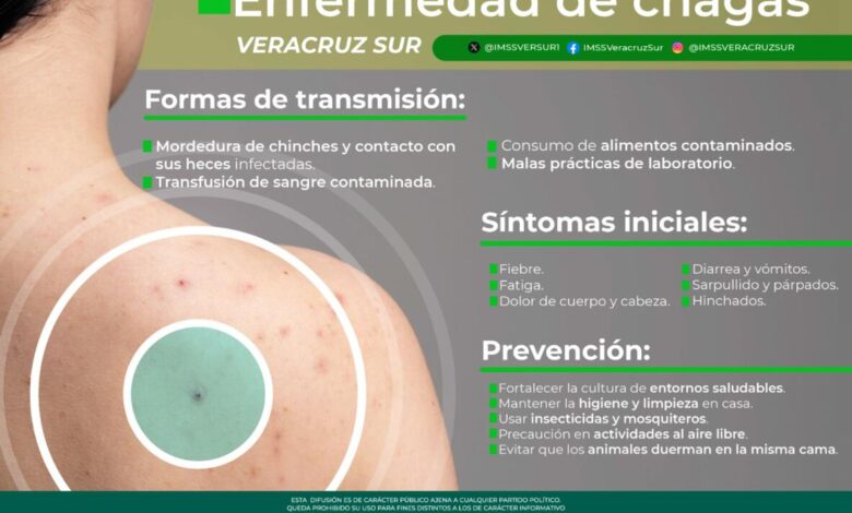 En el marco del Día Mundial de la Enfermedad de Chagas, el Instituto Mexicano del Seguro Social (IMSS) en Veracruz Sur informa a la población sobre este padecimiento y su sintomatología, ya que de no ser tratado a tiempo puede causar problemas al corazón y ser mortal.