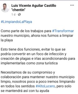 «Necesitamos de su compromiso y colaboración para mantener nuestro municipio limpio, nosotros poco a poco iremos limpiando en todos los sentidos #AltoLucero, pero solo se mantendrá así con tu ayuda» puntualizó.