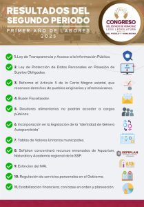Mencionó la aprobación de diversas reformas, como la que permitió la creación del Buzón Fiscalizador, que deudores alimentarios no puedan acceder a cargos públicos y el reconocimiento de la figura legal denominada “Identidad de Género Autopercibida” y las Tablas de Valores Unitarios de algunos ayuntamientos.