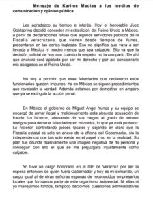 Luego de que fuera declarada extraditable a México, la ex primera dama de Veracruz Karime Macías se dijo inocente de los cargos que le imputan en México y advirtió en un comunicado que seguirá dando “la batalla de su vida” para demostrarlo, al adelantar que apelará el fallo que concede su extradición de Londres.