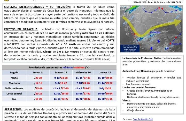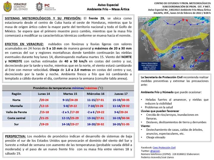 EFECTOS EN VERACRUZ: nublados con lloviznas y lluvias ligeras con valores acumulados en 24 horas de 5 a 10 mm de manera general y máximos de 20 a 30 mm en cuencas del sur y regiones montañosas donde también continuarán las nieblas eventuales durante hoy lunes 14, disminuyendo mañana martes 15. Viento del NORTE y NORESTE con rachas estimadas de 40 a 50 km/h en costas del centro y sur, decreciendo por la tarde y noche, mientras que en la norte, el viento estará cambiando al Este con menor velocidad. Oleaje de 1.0 a 2.0 metros en costas del centro y sur, decreciendo por la tarde y noche. Ambiente fresco a frío que irá cambiando a templado a cálido durante el día, conforme avance la semana (consulte tabla anexa).