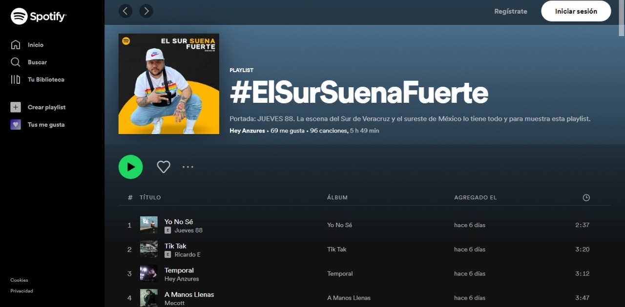 Bajo el nombre de ‘El Sur Suena Fuerte’, una lista de reproducción musical está disponible en Spotify con canciones de artistas de Coatzacoalcos, de la región y del sureste de la República Mexicana; con ello se busca difundir el talento en otras zonas del país; su creador: el diseñador y rapero Oscar Anzures pretende generar una red de apoyo.