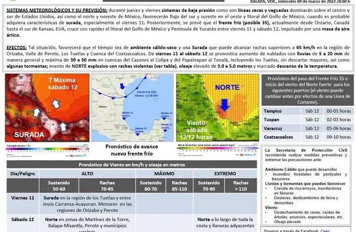 De viernes 11 al sábado 12 se pronostica aumento de nublados con lluvias máximas de 30 a 50 mm en la cuenca del Papaloapan al Tonalá, incluyendo Los Tuxtlas, así como algunas tormentas; evento de norte explosivo con rachas violentas, oleaje elevado de 3.0 a 5.0 metros y marcado descenso de la temperatura.