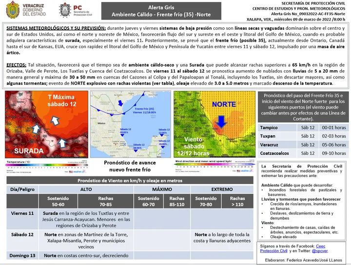 De acuerdo con el pronóstico del tiempo, sistemas de baja presión adquirirían características de surada, y posteriormente, se prevé que el Frente Frío (posible 35), cruce con rapidez el litoral del Golfo de México, el viernes 11 y sábado 12, impulsado por una masa de aire ártico.