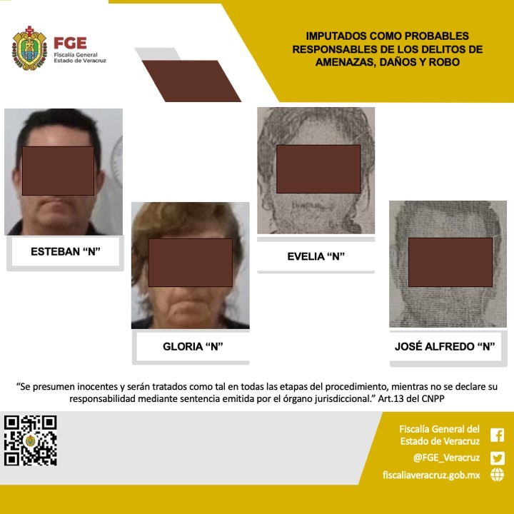 Minatitlán, Ver., a a 5 de febrero del 2025.-La Fiscalía Regional Coatzacoalcos realizó imputación en contra de Esteban “N”, Gloria “N”, Evelia “N” y José Alfredo “N”, como probables responsables de los delitos de amenazas, daños y robo, cometidos en agravio de L.M.C.H.B.
