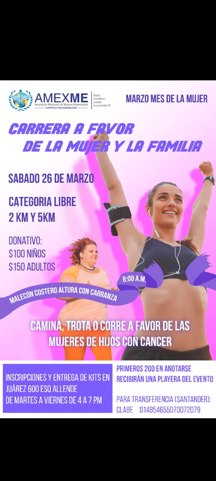 .- La Asociación Mexicana de Mujeres Empresarias (AMEXME) capitulo Coatzacoalcos, realizará el próximo 26 de marzo su primer carrera a favor de la mujer y la familia.