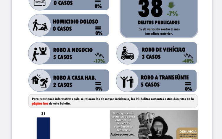De acuerdo con el documento, los atracos a la ciudadanía coinciden en el horario vespertino, mientras que los negocios más afectados en un 75% se trataron de las tiendas de conveniencia, tan solo en dicho mes, se registraron cinco robos a negocios, igual número a transeúntes, tres robos de automóviles y dos a casa habitación.