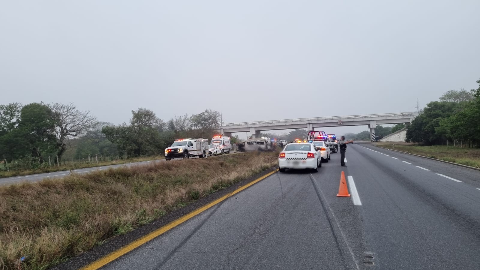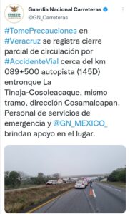 A través de twitter la Guardia Nacional Carreteras reportó el accidente justo sobre la autopista La Tinaja-Cosoleacaque, la mañana de este martes.