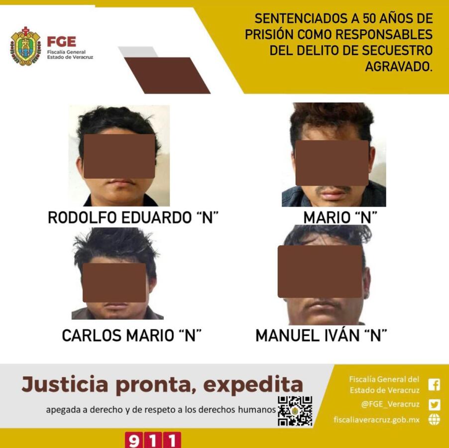 Coatzacoalcos, Ver., 3 de julio de 2024.- La Fiscalía General del Estado informa que, a través de la Unidad Especializada en Combate al Secuestro logró sentencia condenatoria de 50 años de prisión en contra de Rodolfo Eduardo “N”, Mario “N” Carlos Mario “N” y Manuel Iván “N” como responsables del delito de secuestro agravado, cometido en agravio de la víctima M.C.C.M.