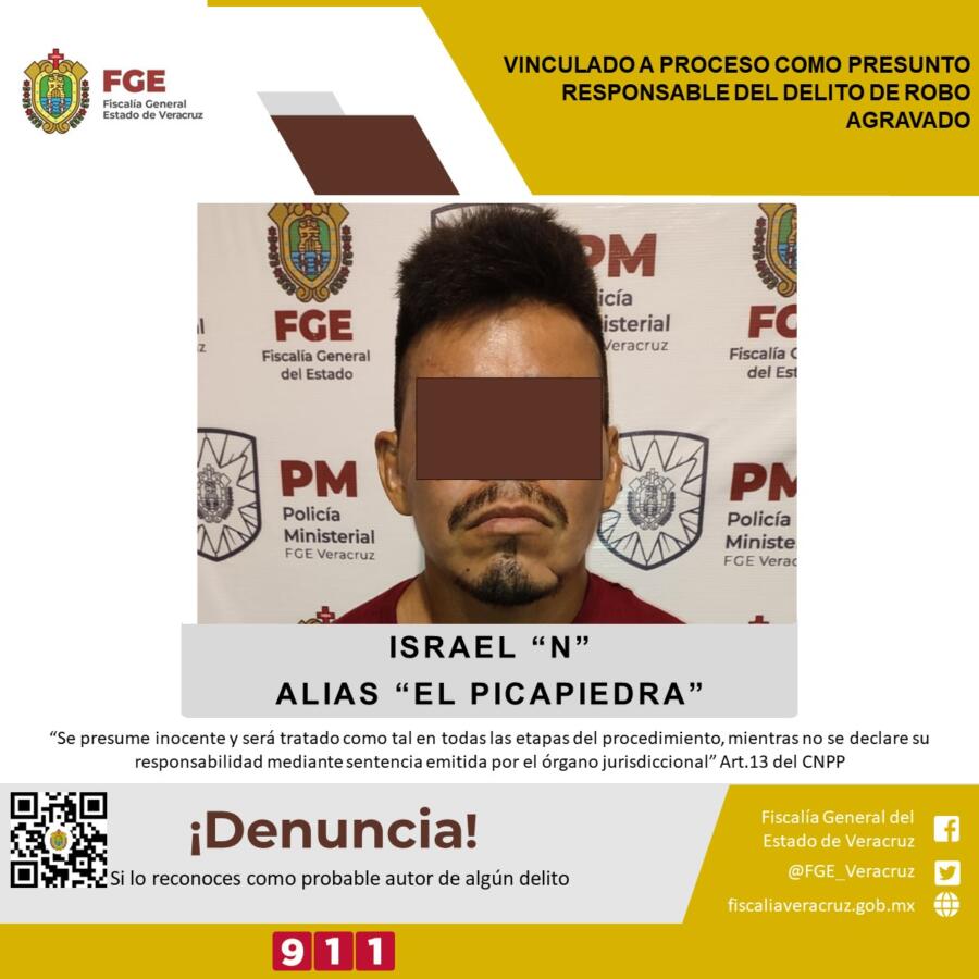 La Fiscalía Regional Coatzacoalcos obtuvo vinculación a proceso en contra de Israel “N” alias “El Picapiedra” como presunto responsable del delito de robo agravado en agravio de la víctima identificada con las iniciales D.I.C.C.